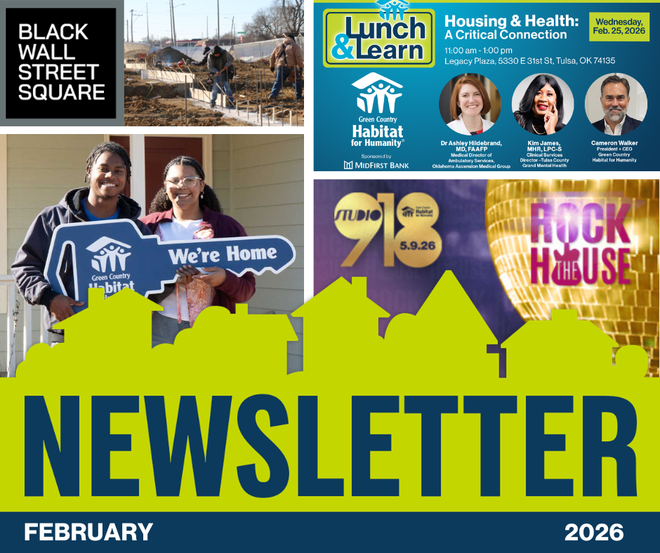 In this month’s newsletter, meet Demitri and Sydney, a young couple who achieved homeownership through Habitat’s program. The issue also highlights the organization’s impact in 2025, progress at Black Wall Street Square, important volunteer updates, and upcoming events including the Housing & Health Lunch & Learn and Rock The House: Studio 918.